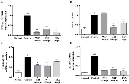 Effects of WIF on AD-induced cytokine activation in DNCB-induced AD-like skin lesions. (A–D) Levels of TNF-α, IFN-γ, IL-6, and IL-13 production were determined via real-time reverse transcription-polymerase chain reaction (RT-PCR). Results are presented as mean ± SD (n = 5 per experiment). # p < 0.01, ### p < 0.001 vs. normal group; * p < 0.05, ** p < 0.01, *** p < 0.001 vs. DNCB-induced group.