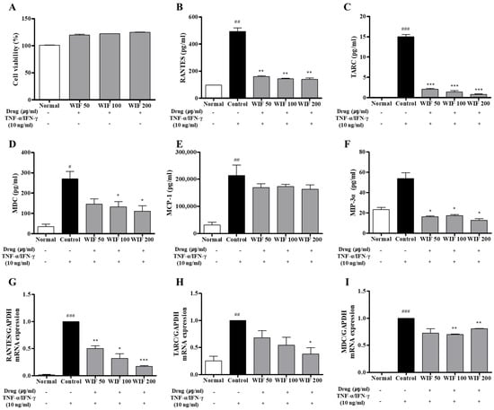Effects of WIF on chemokine levels in TI-stimulated HaCaT cells. (A) WIF cytotoxicity was determined via the EZ-Cytox assay. (B–F) Levels of RANTES, TARC, MDC, MCP-1, and MIP-3α levels were examined via ELISA. (G–I) Production levels of RANTES, TARC, and MDC were determined via real-time RT-PCR. Results are presented as mean ± SD (n = 3 per experiment). # p < 0.1, ## p < 0.01, ### p < 0.001 vs. normal group; * p < 0.05, ** p < 0.01, *** p < 0.001 vs. TI-stimulated group.