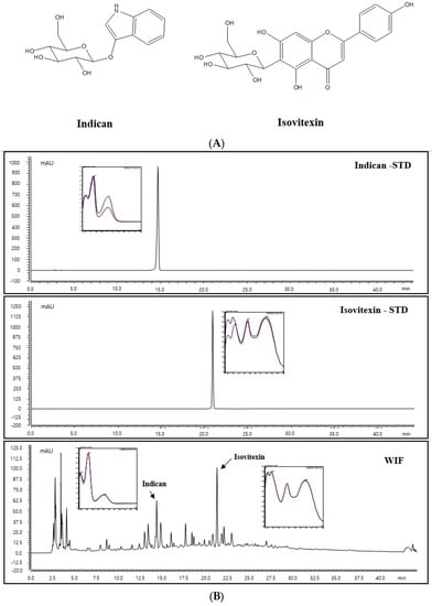 To confirm the contents and identification of two compounds, indican and isovitexin, high-performance liquid chromatography (HPLC) analysis was performed. As shown in Figure 8, prominent peaks in the WIF extract HPLC chromatogram that we analyzed were only two peaks, and these peaks were identified as indican and isovitexin, which compared with the standard compound solution retention time and UV spectrum. Therefore, indican and isovitexin were selected as standard components for analysis. Indican and isovitexin were detected as characteristic peaks that exhibited the highest intensity, minimizing interference from other analyses in WIF. The two compounds were identified via comparison with the retention time (tR; 14.853 and 21.303 min) and ultraviolet (UV) spectrum (280 nm) on the HPLC chromatogram of WIF and the standard component (Figure 8).