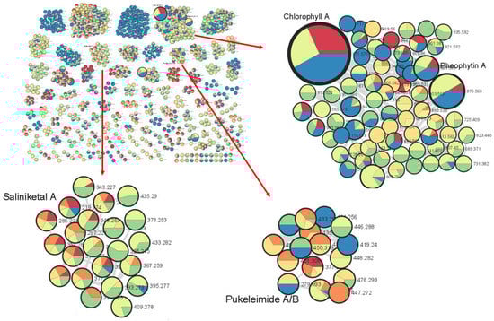 Marine cyanobacterial molecular network with a cosine similarity score cutoff of 0.70. The network was generated when s preliminary extract of cyanobacteria (1 L) was separated into eight fractions based on polarity and then analyzed via LC-MS/MS. The inlaid portions of the network were rearranged in Cytoscape for easier visualization of node connectivity. Compound dereplication based on the GNPS mass spectral database identified clusters of molecular families related to chlorophyll a, pheophytin A, saliniketal a and pukeleimides A/B. The red arrows point to enlargements of selected clusters.