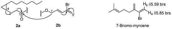 Partial structures of 2a and 2b with arrows indicating 1H-13C HMBC correlations and 7-bromo-myrcene, where the two protons attached to the terminal sp2 carbon atom were found to resonate at δHa 5.85 and δHb 5.59.