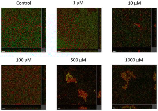 Lyngbyoic acid (1) was previously shown to reduce the pyocyanin and elastase production and transcription levels in wild-type P. aeruginosa []. In addition, the global transcriptional effects of lyngbyoic acid somewhat replicate the gene expression changes of P. aeruginosa during chronic lung infections in cystic fibrosis patients. For the effects of 1 on biofilm genes, they were found to downregulate certain members of the psl operon, such as pslA and pslB, as well as pslN, while it upregulated the entire pelABCDEFG operon, which is needed for the synthesis of a glucose-rich matrix exopolysaccharide, an important component of bacterial biofilms []. In this study, lyngbyoic acid was tested against wild-type P. aeruginosa biofilm formation. P. aeruginosa biofilms were grown for 24 h in the presence of different concentrations of 1 (Figure 4). Biofilms were imaged using a confocal microscope, and the total biovolume (green and red channels) was quantified (Figure 5). A significant reduction in biovolumes was observed when they were treated with concentrations above 500 µM of 1. However, there seems to be no effect from 1 on preformed biofilms.