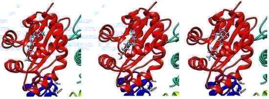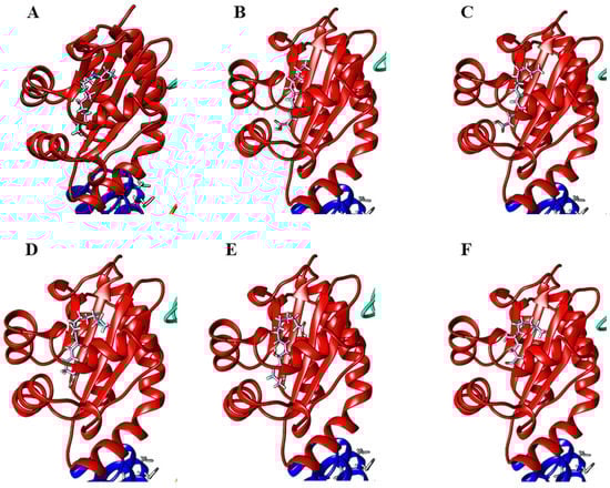 The molecular docking of compounds with LasR proteins comprised the following procedures: ligand preparation, protein selection, docking and analysis of the results. Docking was performed with the SwissDock DockingWeb Service (available online: http://www.swissdock.ch/ (accessed on 28 February 2023)). The three-dimensional structures of the autoinducer, N-3-oxododecanoyl-L-homoserine lactone and cyanobacterial compounds were either obtained from the PubChem database or created using Chem3D and converted into .mol2 files using the OpenBabel platform (http://openbabel.org/wiki/Main_Page/ (accessed on 28 February 2022)). The LasR protein structure was retrieved from the Protein Data Bank (PDB) with reference ID 2UV0. The target + ligand set was considered stable when the values of the binding free energy were lower than −7 kcal/mol. This consideration is based on docking experiments with the known X-ray structure (2UV0) complex of the autoinducer and cyanobacterial compounds resulting in binding-energy values ranging from −10.64 to −7.87 kcal/mol. Once the results of the docking were obtained, they were analyzed with UCSF Chimera.