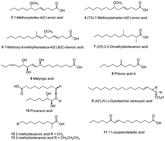 Similar defensive strategies could be used by other marine cyanobacterial strains in producing high amounts of unique modified fatty acids. These modified fatty acids include lyngbic acids (3–5) [,,], malyngic acid (6) [], (2R)-2,5-dimethyldodecanoic acid (7) [], pitinoic acid (8) [], dysidazirine carboxylic acid (9) [], puna’auic acid (10) [], 11-oxopalmitelaidic (11) [], 2-methyldecanoic acid and 2-methyldodecanoic acid [] (Figure 8 and Table 2).