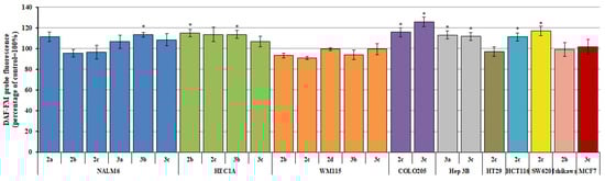 Relative amounts of RNS (DAF-FM probe) generated in NALM6, HEC1A, WM115, COLO 205, Hep 3B, HT29, HCT116, SW620, Ishikawa, and MCF7 treated with investigated compounds. * Results represent mean ± SD of data from three individual experiments, each performed with at least eight repeats; * p < 0.05 versus control.