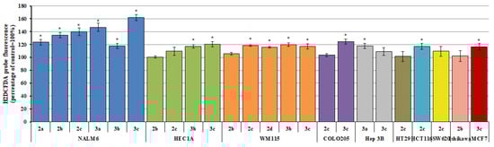 Relative amounts of ROS (H2DCFDA probe) generated in NALM6, HEC1A, WM115, COLO 205, Hep 3B, HT29, HCT116, SW620, Ishikawa and MCF7 treated with investigated compounds. * Results represent mean ±SD of data from three individual experiments, each performed with at least eight repeats; * p < 0.05 versus control.