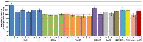 Relative amounts of ROS (DHEt probe) generated in NALM6, HEC1A, WM115, COLO 205, Hep 3B, HT29, HCT116, SW620, Ishikawa, and MCF7 treated with investigated compounds. * Results represent mean ±SD of data from three individual experiments, each performed with at least eight repeats; * p < 0.05 versus control.