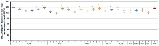 Slightly smaller changes were observed for the DHET probe (Figure 3) and the detection of superoxide generation. Again, NALM6 were the most sensitive cells, where the generated ROS reached the highest level. However, the observed changes were already about 20% smaller than those noted for hydrogen peroxide. In the case of the remaining cancer lines, where statistically significant changes in the level of ROS were observed, hydrogen peroxide increased by about 20–35%.