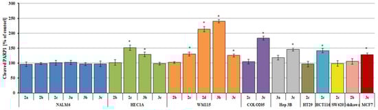 Measurement of PARP1 degradation in NALM6, HEC1A, WM115, COLO 205, Hep 3B, HT29, HCT116, SW620, Ishikawa, and MCF7 treated with investigated compounds. * Results represent mean ± SEM of the data from three individual experiments, untreated control cells arbitrarily taken as 100%, * p < 0.05 vs. control.
