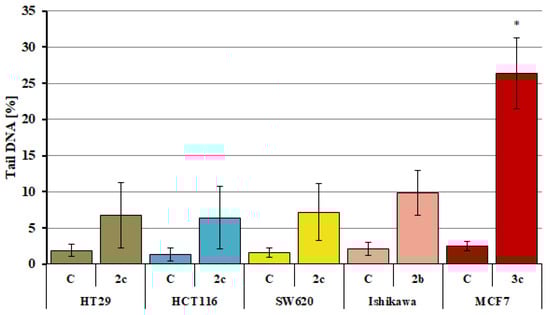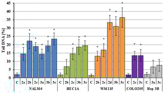 DNA content in the tail of the comet obtained from NALM6, HEC1A, WM115, COLO 205, Hep 3B, HT29, HCT116, SW620, Ishikawa, and MCF7 treated with investigated compounds. The cells were exposed for 24 h to IC50 concentration of complexes. C on the axis of the plot represents untreated control cells. * Results represent mean ± SEM of the data from three individual experiments, and for each analysis, 100 randomly chosen comets were counted, * p < 0.05 vs. control.