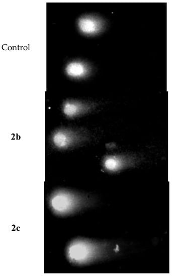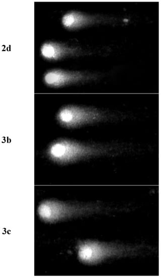 Sample images of the DNA damage analysis based on the alkaline comet test (single cell electrophoresis) are shown in Figure 8. Supercoiled DNA loops are visible. They are connected to the nuclear matrix of untreated control cells, which retain a compact comet head-like structure. Staining with the fluorescent dye DAPI (4′, 6-diamidin-2-phenylin) results in the emission of very bright and intense fluorescence. In cells with damaged DNA damage, DNA supercoils are more relaxed and therefore migrate behind the head, creating a comet tail with weaker fluorescence. The cells were incubated with derivatives for 24 h at concentrations of the calculated IC50.
