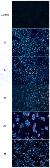 Changes in mitochondrial potential are seen in the initial stages of apoptosis. They testify to the disturbance of mitochondria and the activation of complex machinery of the programmed cell death pathway. MMP changes were tested using the cationic carbocyanine dye JC-1, which is the most commonly used fluorescent probe in the study of mitochondrial membrane potential changes and the detection of its depolarization/hyperpolarization in cells in vitro. The conducted analysis (Figure 10) showed that the tested derivatives strongly influenced the mitochondrial potential of cancer cells. Only HT29 and HCT116 cells did not demonstrate any statistically significant changes. Interestingly, the compounds, depending on the cell line, caused hyperpolarization or depolarization of mitochondrial membranes. Hyperpolarization of the inner mitochondrial membrane was observed in NALM6, COLO205, and MCF7 cells, where it was approximately 20–60%. The remaining lines demonstrated membrane depolarization, i.e., a decrease in mitochondrial potential. A particularly high decrease (almost 50%) was recorded for HEC1A treated with compounds 2c and 3b. In the remaining cases, the decrease in mitochondrial potential was slightly smaller and ranged from ~20%.