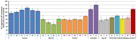 Changes in the mitochondrial potential of NALM6, HEC1A, WM115, COLO 205, Hep 3B, HT29, HCT116, SW620, Ishikawa, and MCF7 treated with investigated compounds. * Results represent mean ± SEM of the data from three individual experiments, and for each analysis, 100 randomly chosen comets were counted, * p < 0.05 vs. control.