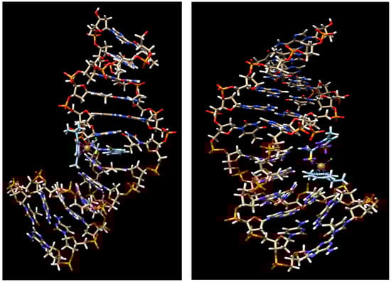 The density functional theory (DFT) calculations were carried out using the Gaussian16 program [] with ωB97X-D functional [,] expressed in the def2-TZVP basis set []. The crystal structures of tyrosine hydroxylase (PDB ID: 1TOH []), UDP-D-glucose-6-dehydrogenase (PDB ID: 4EDF []), and the DNA fragment (PDB ID: 1FYY []) were long enough to allow for studies of intercalation and binding to the minor groove (all data were retrieved from the protein data bank (http://www.rcsb.org/) (accessed on 3 February 2023) []. Since blind docking was not possible in the case of 1TOH, the study examined the dependence of results on the radius (from catalytic iron) of the docking sphere; it was found that the scoring functions are not dependent on the radius. Therefore, both enzymes used a default radius of 10 Å, which proved to be adequate for blind docking in the case of 4EDF (chain A). In the case of 1FYY, the docking conditions comprised spheres with a 7.5 Å radius, centered either at the center of the natively-intercalated ligand, or the spheres with 7 Å radius moved toward the groove, as described previously []. The metallo-protease template was used for 1TOH, and the default template for the other two enzymes. Visualization was performed using Chimera [], Mercury [], and GaussView Version 6.1; Shawnee Mission, KS, USA [] software.