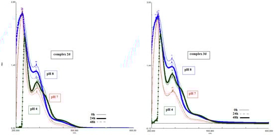 The stability measurements were performed on a UV 1800 Shimadzu spectrophotometer (Kyoto, Japan) at room temperature. The complexes 2d and 3d were tested for the stabilities in buffer Na2HPO4 (pH 4 and 8). UV–Vis spectra were recorded hourly for 48 h at 22 °C. The spectra were recorded in the range of 200–800 nm over a time course of 0, 24, and 48 h.