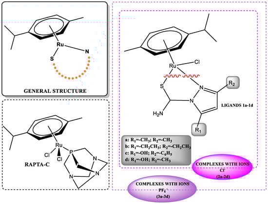 Characteristics of general structure of RAPTA–C and arene–ruthenium(II) complexes with carbothioamidopyrazoles 2a/3a–2d/3d and its ligands 1a–1d.
