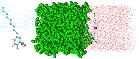 In this study, the molecular interactions between hydroxyoximes and Cu2+ were investigated near the hexane/water interface. The oil/water interface was simulated by constructing a 5 × 5 × 5 nm box of water placed next to a 5 × 5 × 5 nm box of hexane, as shown in Figure 2 (right). Two extractant molecules (Figure 2 (left)) and a cation Cu2+ was placed in the aqueous phase close to the oil/water interface.