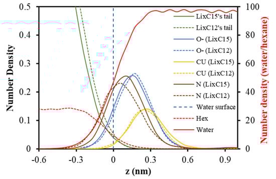 It can be seen that Cu2+ ions reside at a similar distance from the oil/water interface despite altering the carbon chain length of the extractants. The distribution means that tail length has an insignificant effect on cation position. The carbon length also indicates a reasonable range for complex transfer between the two phases. Longer tails would reduce the solubility of extractants in the aqueous phase, whereas shorter tails would expel the complexation further into the water phase.