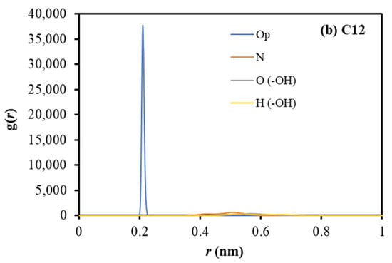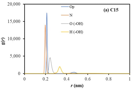 The simulation procedure included the following main steps. Firstly, the system was simulated at constant temperature and pressure (298 K and 1 atm, respectively) using a Berendsen barostat with a relaxation time of 2 ps and a cut-off of 1.3 nm to reach an equilibrium stage. After the equilibrium stage, the x-, y-, and z-dimensions of the simulation box were adjusted accordingly. The simulation was then performed for 20 ns at constant temperature (298.15 K) and volume using a Nose–Hoover thermostat []. This simulation time has been widely applied in the literature to ensure the achievement of an equilibrium stage of small extractant and surfactant molecules. The last 10 ns of this production run were used for density and radial distribution function (RDF) analyses. The geometry of the water molecules and bond lengths of extractant molecules were kept unchanged by employing LINCS [] algorithms. Ewald [] sums were used to deal with the electrostatic interactions. The density and RDF were obtained by analysing the trajectories recorded every 500 fs. Density and RDF were calculated via functions supplied with GROMACS.