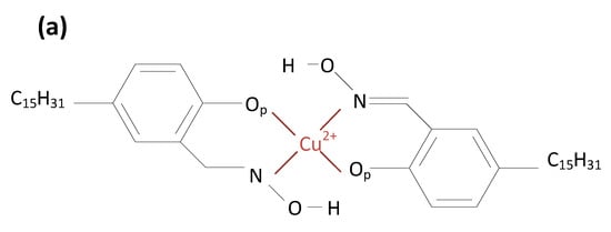 Extractant-Cu2+ coordination structure for (a) C15 and (b) C12 oximes.