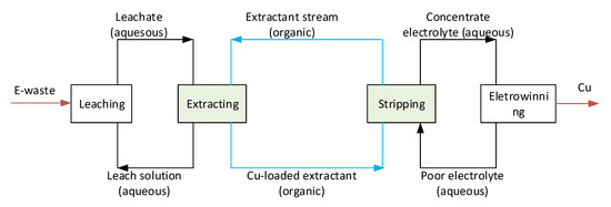 On the other hand, it is estimated that 45% of copper is currently disposed of in landfills and waste incinerators []. The percentage of collected and recycled metals is particularly low in developing countries due to a lack of technology, financial resources, and regulations []. It is estimated that a recycling rate of 70–90% is needed to achieve the 2 °C climate scenario. Such an ambitious recycling rate will require significant improvements in recycling processes. Consequently, there is an urgent need to develop an economical and practical process with potential application for localised and small-scale collection and recycling facilities. In addition to the mechanical collection and separation processes, the chemistry aspect of recycling also needs to be improved [].