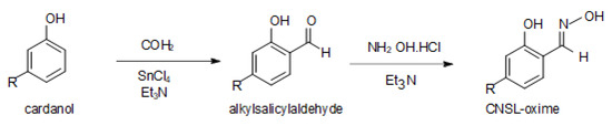 Cardanol was received from a cashew nut shell processing facility in Binh Phuoc Province, Vietnam. The conversion of cardanol to hydroxyoxime was carried out through two reactions process (Figure 7).