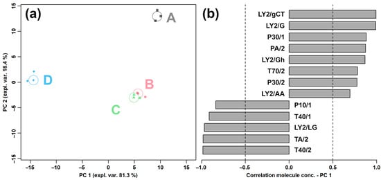 In Figure 1a, PC 1 accounted for 81.3% of the variance of the entire samples’ set, thus nicely summarizing the overall flavor characteristics of L. plantarum under different capsaicin concentrations. In detail, group A showed the highest response values of LY2/gCT, LY2/G, P30/1, PA/2, LY2/Gh, T70/2, P30/2, and LY2/AA, and the lowest response values of P10/1, T40/1, LY2/LG, TA/2, and T40/2 among the four groups.