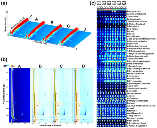 Among the characterized VOCs, 38 VOCs showed significant differences among the four groups. An rPCA model was built according to the peak intensities of VOCs to highlight the overall trend of the flavor profile (Figure 4).