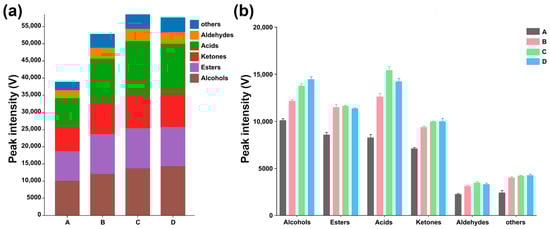 Peak intensities of each category of VOCs produced by L. plantarum fermented for 24 h under different capsaicin concentrations. (a) Peak intensity of total VOCs among the four groups. (b) Peak intensities of each category of VOCs among the four groups.