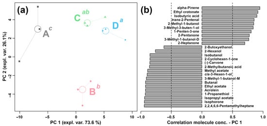 The rPCA model calculated on the basis of VOCs shows significant differences in peak intensities among groups. Scoreplot (a) displays the overall structure of the data. Superscript lowercase letters indicate the significance of samples along PC 1. Loading plot (b) displays significant correlation between the peak intensity of each VOC and the importance over PC 1 (p < 0.05).