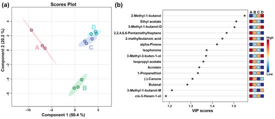 PLS-DA of VOCs produced by L. plantarum samples under different capsaicin concentrations. (a) Score plot. (b) VIP scores. A, B, C, and D represent capsaicin concentrations of 0, 0.125, 0.25, and 0.5 mg/mL, respectively.