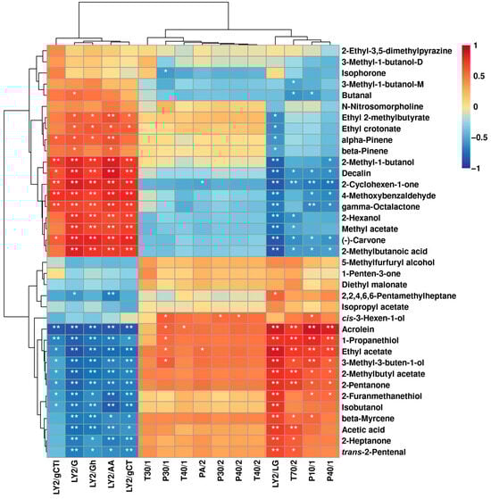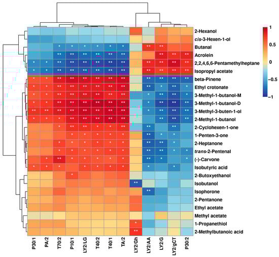 Spearman’s correlation heatmap displays the correlation between E-nose sensor responses and VOCs’ contents. Each color represents the correlation coefficient, with blue and red indicating negative and positive correlations. “*” and “**” represent significance at p < 0.05 and p < 0.01, respectively.