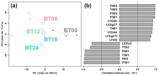 In Figure 7a, PC 1 accounted for 88.6% of the variance of the entire samples’ set, thus nicely summarizing the overall characteristics of the L. plantarum samples during fermentation under capsaicin stress. In detail, BT00 showed significantly higher response values of P40/2, T40/2, P30/2, P30/1, LY2/Gh, LY2/gCT, T40/1, LY2/AA, LY2/gCTI, and LY2/G and significantly lower response values of LY2/LG, T70/2, P40/1, T30/1, PA/2, and P10/1.