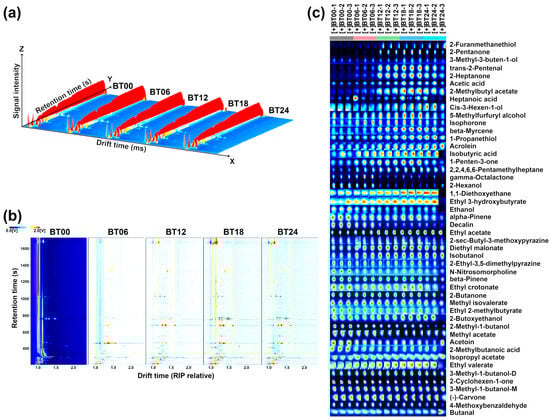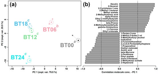 Compared to BT00, BT06, BT12, BT18, and BT24 were found to be mainly characterized by higher contents of 1-penten-3-one, 3-methyl-3-buten-1-ol, 5-methylfurfuryl alcohol, isobutanol, 2-furanmethanethiol, 2,2,4,6,6-pentamethylheptane, 1-propanethiol, diethyl malonate, acetic acid, beta-myrcene, 2-pentanone, ethyl acetate, trans-2-pentenal, 2-methylbutyl acetate, and 2-heptanone and by lower contents of decalin, 2-hexanol, 2-cyclohexen-1-one, 2-methyl-1-butanol, methyl acetate, 2-methylbutanoic acid, alpha-pinene, ethyl 2-methylbutyrate, N-nitrosomorpholine, beta-pinene, 4-methoxybenzaldehyde, gamma-octalactone, (-)-carvone, and ethyl crotonate.