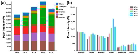 The gallery plot (Figure 8c) showed that VOCs of L. plantarum during fermentation under capsaicin stress mainly pertained to acids and alcohol. Compared to BT00, the total relative content of VOCs was increased in BT06, BT12, BT18, and BT24, as shown in Figure 9. The peak intensities of VOCs among the groups are shown in Table 2.