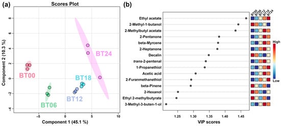 In Figure 11a, component one accounted for 45.1% of the total variance and is well-discriminated. Figure 11b shows VIP scores of the top 15 VOCs, namely, ethyl acetate, 2-methyl-1-butanol, 2-methylbutyl acetate, 2-pentanone, beta-myrcene, 2-heptanone, decalin, trans-2-pentenal, 1-propanethiol, acetic acid, 2-furanmethanethiol, beta-pinene, 2-hexanol, ethyl 2-methylbutyrate, and 3-methyl-3-buten-1-ol.