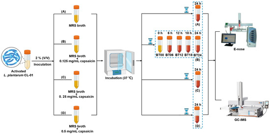 The activated L. plantarum CL-01 were inoculated into MRS broth with concentrations of 0 (A), 0.125 (B), 0.25 (C), and 0.5 (D) mg/mL capsaicin at an inoculum of 2% (v/v), respectively, and left to incubate at 37 °C for 24 h. In addition, activated L. plantarum CL-01 was inoculated into MRS broth with 0.125 mg/mL capsaicin at an inoculum of 2% (v/v) and incubated at 37 °C for 0 h (BT00), 6 h (BT06), 12 h (BT12), 18 h (BT18), and 24 h (BT24), as shown in Figure 13.