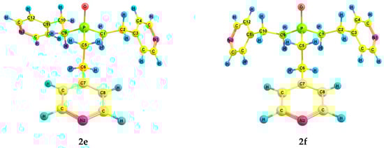 An increase in the coordination of the phosphorus atom did not lead to an increase in the number of energetically preferred conformers. For phosphine oxide 2, six conformers (2a–f) were also found (Table 2 and Table 3, Figure 2), in which the phosphorus atom is pyramidal, the Csp3–Csp3 bonds are mainly gauche-oriented relative to the phosphoryl group, and the pyridyl rings are gauche-oriented relative to the Csp3–Csp3 bonds. Symmetrical conformer 2a with zero ΔE is characterized by a zigzag configuration of ethylene bridges. It should be noted that the structure of conformer 2a corresponds to the structure of tris[2-(4-pyridyl)ethyl]phosphine oxide obtained by X-ray analysis [42]. In 2b, one ethylene bridge has a pincer-like configuration, and in 2c, two bridges are pincer-like. In conformer 2d, one of the substituents is inverted compared to those in 2a. Conformer 2e differs from 2a in the trans-orientation of one of the Csp3–Csp3 bonds. In conformer 2f, one of the Csp3–Csp3 bonds is trans-orientated relative to the phosphoryl group, and the ethylene bridge is zigzag. Two other Csp3–Csp3 bonds are gauche-oriented relative to the P=O bond, and the ethylene bridges are pincer-like in these substituents.