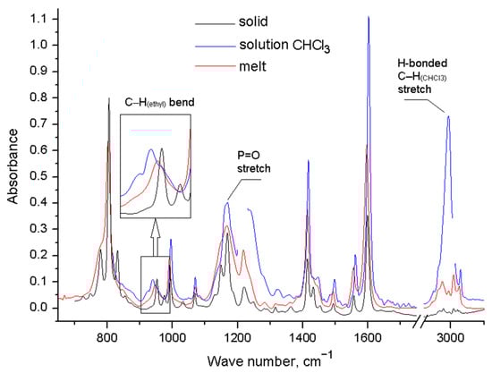We have registered the IR spectra of the compounds 2–4 in the solid state, in the melt, and in trichloromethane solution. In all spectra recorded for the solutions, there is a peak corresponding to the stretching vibrations of the bound C–H group of trichloromethane, which indicates the interaction of the substance with the solvent. The IR spectra of phosphine oxide 2 shows a change in the number of absorption bands in the melt and in solution (Figure 3, Table S1). The spectrum of solid 2 corresponds to the simulated spectrum of conformer 2a with zero ΔE, the structure of which corresponds to the X-ray data [43]. In the region of bending vibrations of C–H bonds in ethylene bridges, one band at 953 cm−1 is observed. In the melt, this band is slightly shifted (ν = 948 cm−1), and a shoulder appears in the region of lower frequencies (about 920 cm−1); in this region, the vibrations of conformers with a different structure of substituents appear in the simulated spectra. The spectrum of the solution of 2 contains three bands—at 925 cm−1, 939 cm−1, and 952 cm–1—in this region, which indicates the appearance of other conformers.