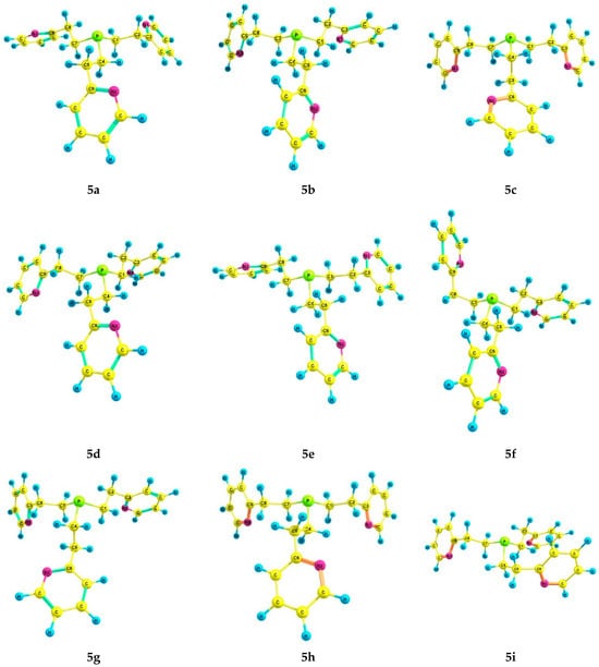 All possible conformations for compounds 1–8 were built by the successive rotation of the parts of the molecule relative to single bonds using the GaussView 6.0 [69] and Chemcraft Version 1.7 [70] imaging software. In all cases, we considered singlet molecules with a neutral charge. Conformations with overlapping atoms or with a too-close arrangement, which have no physical meaning, were rejected during the construction. At the first stage, the calculations were implemented using the small basis set 6-31G(d). According to the calculation results, degenerate structures and conformers with high values of relative energy (more than 14 kJ/mol) were discarded. Then, we performed the calculations in the extended basis set 6-311++G(df,p) and selected the preferred conformers with relative energies less than 7.6 kJ/mol while removing mirror isomers with the same dipole moments and relative energies. Next, refinement calculations were carried out for the preferred conformers in solution using the CPCM model, which takes into account the influence of the solvent and gives more accurate values of the dipole moments [52,54]. The percentage of conformers was calculated from the Gibbs free energies.
