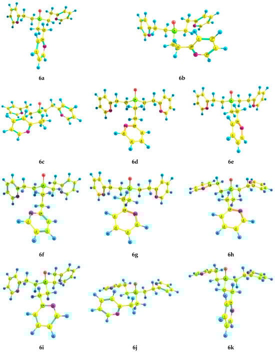 With the introduction of the phosphoryl group, the number of preferred conformers of phosphine oxide 6 was reduced to eleven (Table 4, Figure 5). The conformers 6a–k have the following common features: the pyramidal structure of the phosphorus atom and gauche-orientation of the pyridyl rings relative to the Csp3–Csp3 bonds in the pyridylethyl fragment (Table 5). In conformers 6a–c, 6e, and 6g–k, the Csp3–Csp3 bonds of all three pyridylethyl substituents are gauche-oriented relative to the P=O group; in 6d and 6f, one of the ethylene bridges has a trans-orientation (Table 5), which leads to an increase in the energy of these conformers, as in the case of phosphine 5. A successive change in the configuration of the ethylene bridges to a pincer-like configuration also leads to an increase in the relative energy in conformers 6b and 6c. In 6j, one bridge is pincer-like, and the rest are zigzag.