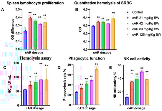 The mononuclear–phagocyte system consists of mononuclear cells in the blood and macrophages in tissues, both of which have phagocytic functions to eliminate foreign substances. The mononuclear–phagocyte system can also secrete protective substances such as interleukin-1 (IL-1), interferons, and complement. Thus, the phagocytic function of macrophages is another indicator used to evaluate the immune function of the body. We employed the well-characterized method of the phagocytosis of chicken RBCs via mouse peritoneal macrophages to measure the phagocytic function in this study. Figure 3D shows that cAR can significantly increase the phagocytic function in mice in a dose-dependent manner.