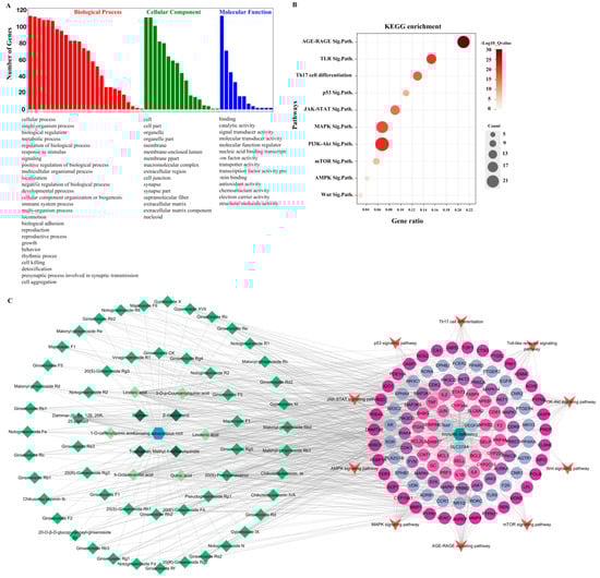Results of the network pharmacological analysis. (A) GO enrichment, GO terms are in descending order; (B) bubble chart of KEGG enrichment (Sig.Path. represents signaling pathway); (C) cAR components–core targets–key pathway.