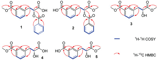 Key HMBC and 1H-1H COSY correlations of 1–5.