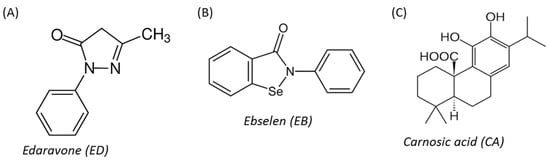 Chemical structure of edaravone (A), ebselen (B), and carnosic acid (C).