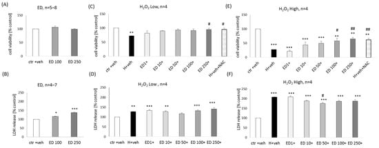 ED at concentrations of 100 and 250 μM did not evoke any reduction in cell viability in primary neuronal cell cultures (Figure 2A) but slightly increased the LDH release (17–37%) (Figure 2B). A significant neuroprotective effect of ED (100 and 250 μM) was found in the model of neuronal cell damage induced by lower (150 μM) and higher (200 μM) concentrations of H2O2 at the level of the cell viability assessment. This effect was comparable to protection mediated by positive control, NAC (1 mM) (99.28% and 94.15–105.29% of NAC efficiency for low and high H2O2, respectively) (Figure 2C,E). In the cytotoxicity assay, a slight reduction was observed of the high H2O2-evoked changes in this parameter by ED at a concentration of 50 μM (Figure 2F), but no impact of ED was found on low H2O2-induced LDH release (Figure 2D).