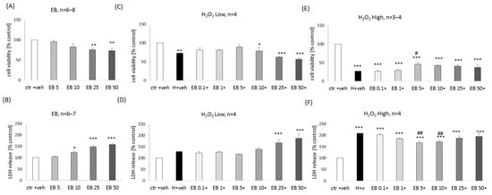 In primary neuronal cell cultures, EB at concentrations of 25 and 50 μM evoked a significant reduction (about 25%) in cell viability (Figure 3A), and at concentrations of 10–50 μM, gradually increased (23–57%) LDH release (Figure 3B). A moderate neuroprotective effect of EB was found only in the model of cell damage induced by high H2O2 (73.56% of NAC efficiency), and it was significant for the concentration of 5 μM in MTT reduction assay (Figure 3E) and for concentrations 5 and 10 μM in LDH release assay (Figure 3F).