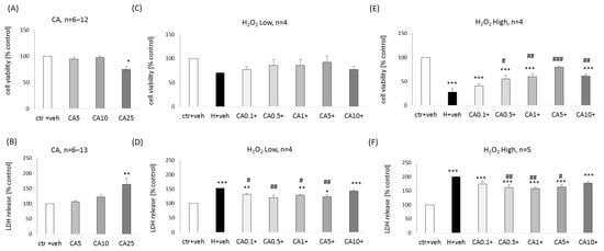 Biosafety (A,B) and neuroprotection (C–F) assessment against the hydrogen peroxide (H2O2)-induced cell damage by carnosic acid (CA) in primary neuronal cell cultures. The eight days in vitro cortical neurons were treated either with vehicle or with CA alone (5–25 μM) or CA (0.1–10 μM) in combination with low (150 μM) or high (200 μM) concentrations of H2O2 for 24 h. Cell viability (A,C,E) and cytotoxicity (B,D,F) were measured by MTT reduction and LDH release assays, respectively. The data were normalized to vehicle-treated cells and presented as the mean ± SEM. The number of independent experiments (n) is indicated in each graph. * p < 0.05, ** p < 0.01 and *** p < 0.001 vs. vehicle-treated cells; # p < 0.05, ## p < 0.01 and ### p < 0.001 vs. H2O2-treated cells.