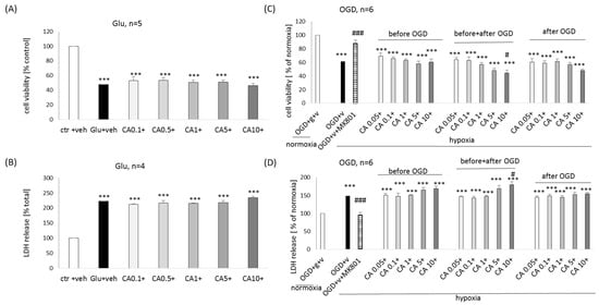 In the Glu model of neuronal cell damage, we did not notice any protection mediated by CA (0.1–10 μM) in both MTT reduction (Figure 5A) and LDH release (Figure 5B) assays. In the OGD model of neuronal cell damage, we also did not find any protection mediated by CA (1–10 μM) in both assays for assessment of cell viability/toxicity (Figure 5C,D). Moreover, in the MTT assay for CA at a concentration of 10 μM (given before and after OGD), we found a significant exaggeration (about 16%) of the OGD-evoked cell damage (Figure 5C).