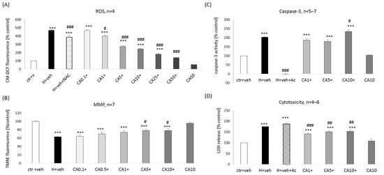 A decrease in MMP could lead to the release of pro-apoptotic factors like cytochrome c or AIF (apoptosis-inducing factor), which in the next steps could activate caspase 3-dependent or caspase-3-independent apoptosis, respectively [41]). Thus, we verified if CA has any effect on H2O2-induced caspase-3 activity. We showed an almost two-fold increase in caspase-3 activity after 9 h of treatment with H2O2 (200 μM), which was completely inhibited by caspase-3 inhibitor, Ac-DVD-CHO (20 μM) but not affected by CA (1–5 μM) (Figure 6C). In parallel, we observed that CA (1–10 μM) attenuated the H2O2-evoked LDH release (Figure 6D), evidencing shorter than 24 h exposure protective action of CA. Although CA, at a concentration of 10 μM slightly increased the H2O2-induced caspase-3 activity (Figure 6C), it did not have any detrimental effect since, in the cytotoxicity test, we observed protection by CA at this concentration (Figure 6D).